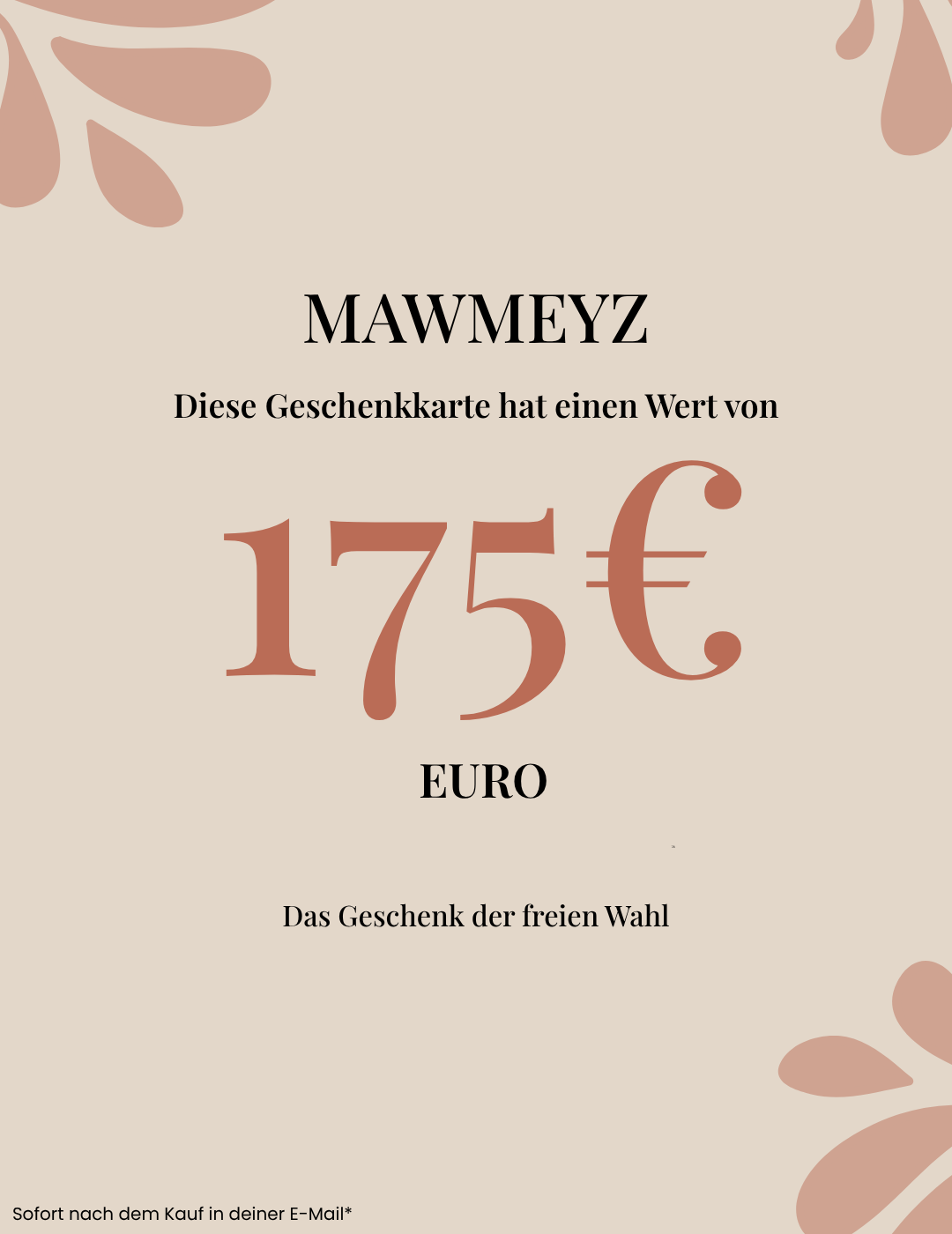 Du möchtest einer werdenden oder frischgebackenen Mama eine besondere Freude machen, bist aber unsicher, was sie wirklich braucht? Unsere MAWMEYZ Geschenkkarte ist die liebevollste Antwort. Damit liegst du garantiert immer richtig und schenkst pure Unterstützung, ganz ohne Stress. Gib ihr die Freiheit, selbst zu entscheiden, was ihr und ihrem Baby in diesem Moment am besten guttut. Es ist mehr als nur ein Gutschein – es ist eine Geste, die sagt: "Ich denke an dich und bin für dich da." Die digitale Geschenkkarte kommt sofort nach dem Kauf per E-Mail und kann direkt im Shop eingelöst werden. Ein Geschenk voller Wärme, Fürsorge und freier Wahl.