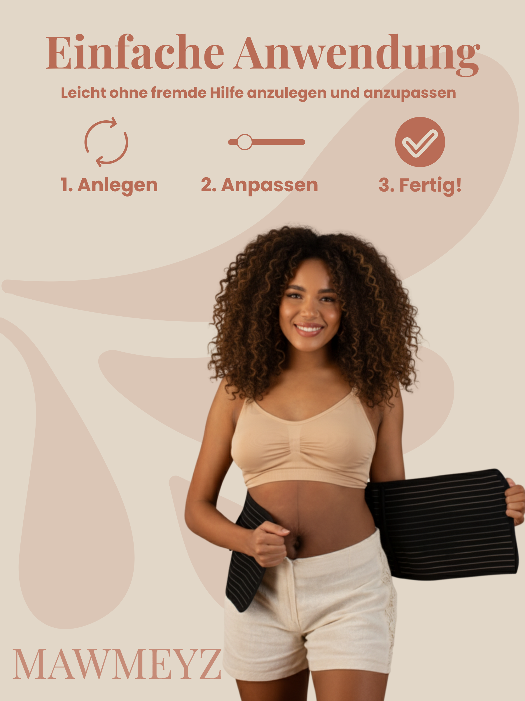 Bei regelmäßiger Anwendung verbessert sich Ihre Körperhaltung und Ihr Körper passt sich sanft an. Jede Mawmey hat ihren eigenen Weg – hören Sie auf Ihren Körper und sprechen Sie mit Ihrer Hebamme oder Ihrem Arzt, um sicherzustellen, dass der Stützgürtel Ihre Genesung optimal unterstützt.